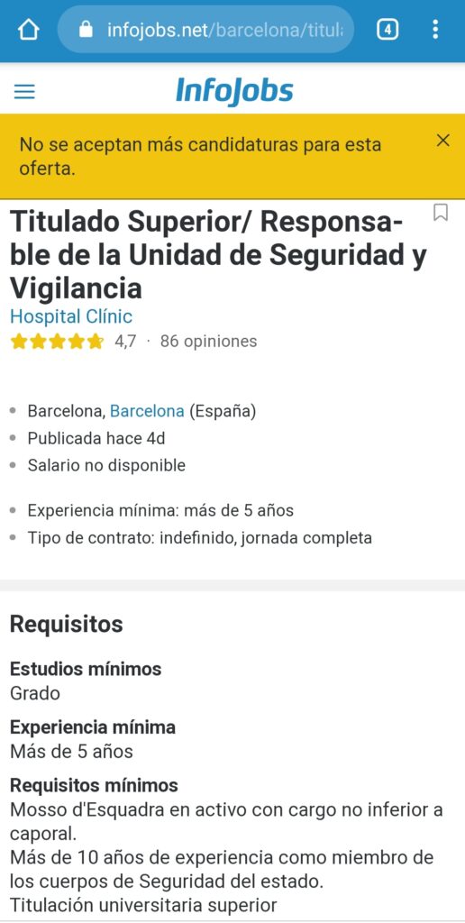 El pasado día 21 de Enero del 2021 el Hospital Clínic público una oferta de trabajo para su Departamento de Seguridad.