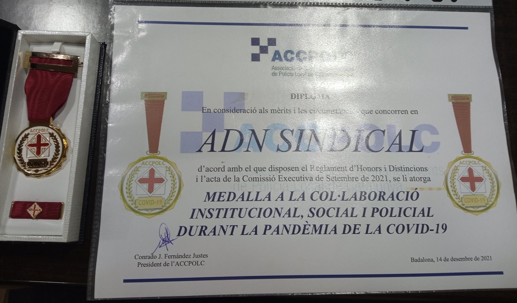 Este 14 de diciembre la ACCPOLC – Asociació de Caps i Comandaments de la Policia Local de Catalunya, ha otorgado a ADN Sindical de Seguridad y Servicios de Cataluña la “Medalla a la Col.laboració Institucional, Social i Policial durant la Pandemia del COVID-19” del personal de Seguridad Privada. Nuestro Asesor General, Sergio Sánchez recibió la condecoración en nombre de nuestro sindicato de manos del Alcalde de Parets D. Francesc Juzgado y en presencia del Subdelegado del Gobierno en Barcelona D. Carlos Prieto, del Secretario General del Departament d’Interior de la Generalitat de Catalunya D. Oriol Amorós, el Alcalde de Badalona D. Rubén Guijarro y diversos mandos policiales representantes de accpolc y otras autoridades.