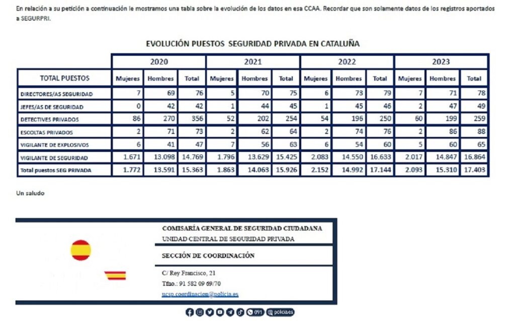 La UNIDAD CENTRAL DE SEGURIDAD PRIVADA DEL CUERPO NACIONAL DE POLICIA, nos ha enviado a petición la evolución de los puestos del SECTOR en Cataluña.