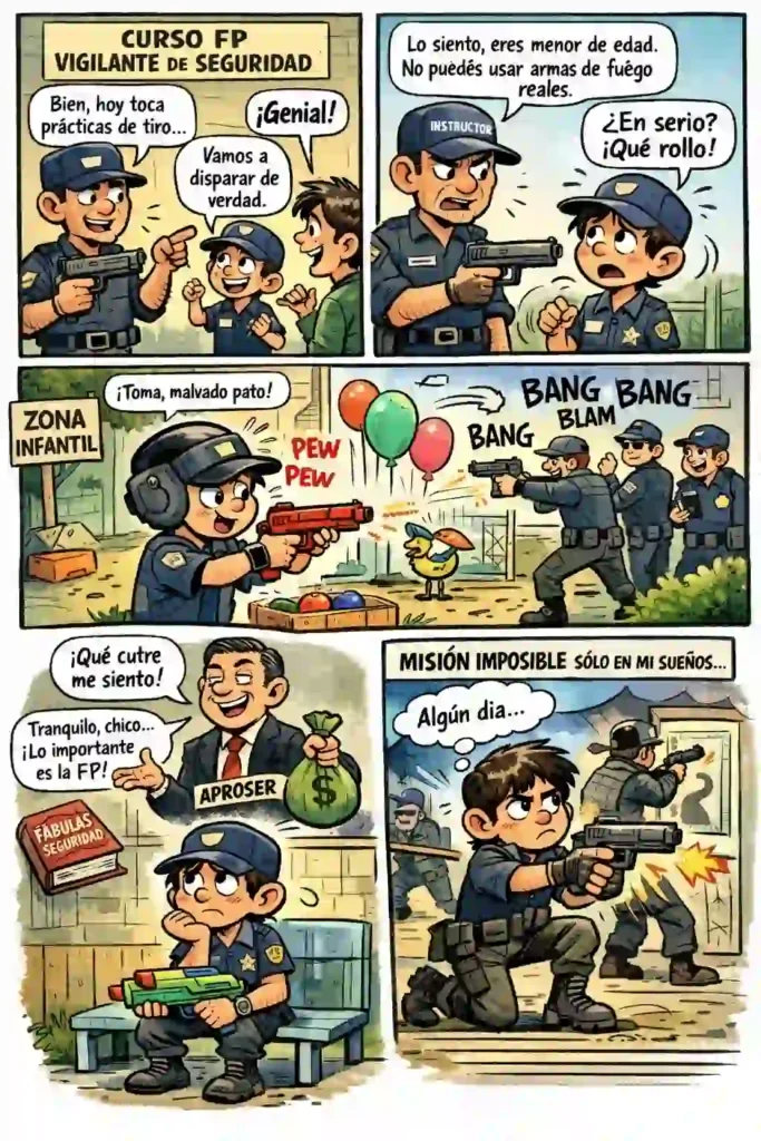 Y claro, todo muy coherente: formamos futuros vigilantes de seguridad… pero sin que toquen un arma de fuego ni en prácticas.