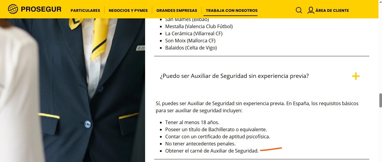 La semana del 10 de Febrero del 2026 PROSEGUR (principal mercantil y presidenta de la mayor patronal del sector a nivel nacional) subió a su web una oferta de trabajo de AUXILIAR DE SEGURIDAD para trabajar en Barcelona, Madrid y País Vasco.