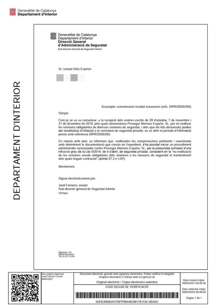 El Departament d’Interior ha abierto expediente sancionador contra dicha empresa por una posible infracción GRAVE de la Ley de Seguridad Privada. La sección sindical en PROSEGUR ALARMAS de Tarragona por ADN SINDICAL DE SEGURIDAD Y SERVICIOS DE CATALUÑA en el año 2019 ya hizo llegar varios escritos y ahora han terminado de investigar la documentación que se les hizo llegar.